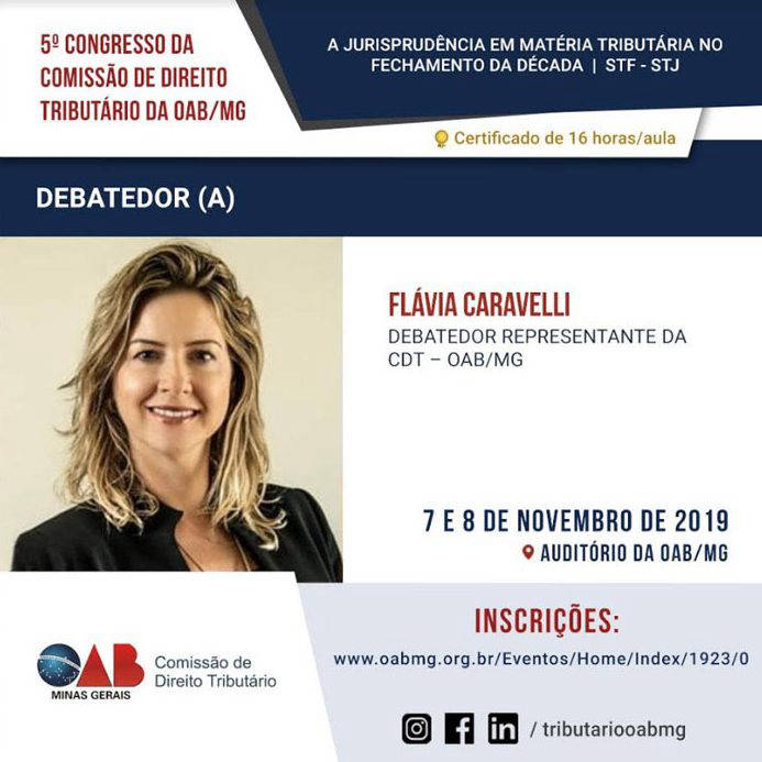 A sócia Flávia Vilela Caravelli participou, em 08/11/2019, do 5º Congresso da Comissão de Direito Tributário da OAB/MG, na qualidade de debatedora no Painel “Processo Tributário,” onde foram tratados temas como “Prescrição intercorrente”, “A (im)possibilidade de concessão de efeito suspensivo nos Embargos à Execução Fiscal”, “Cumprimento do conteúdo declaratório no mandado de segurança” e a “A jurisdição de competência no mandado de segurança”.