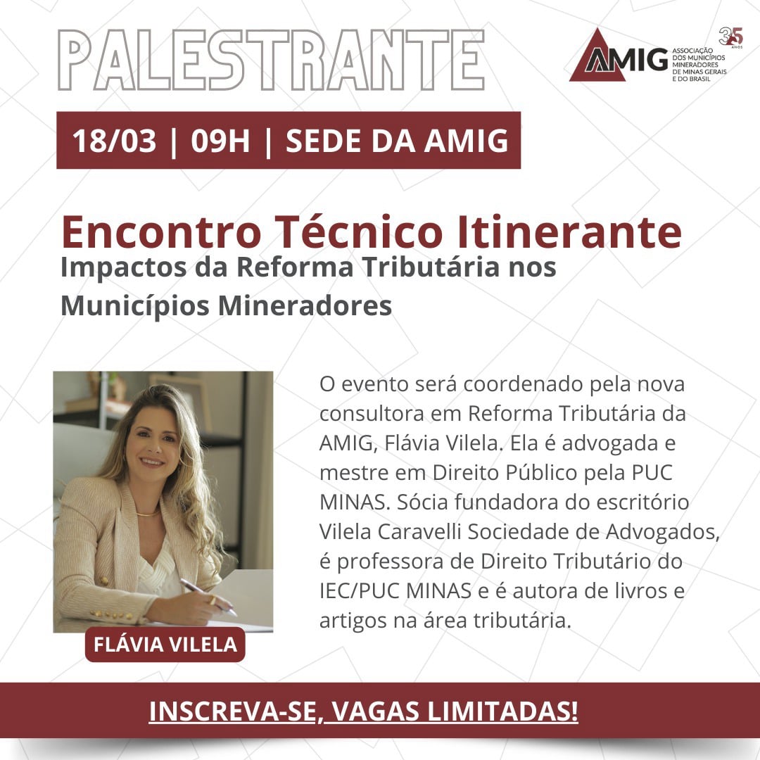 O Encontro Técnico Itinerante: Impactos da Reforma Tributária nos Municípios Mineradores, aconteceu na sede da AMIG em março, e nossa sócia fundadora, Flávia Vilela, consultora em Reforma Tributária da AMIG, foi palestrante do evento, trazendo questões essenciais sobre os desafios e oportunidades para os municípios.