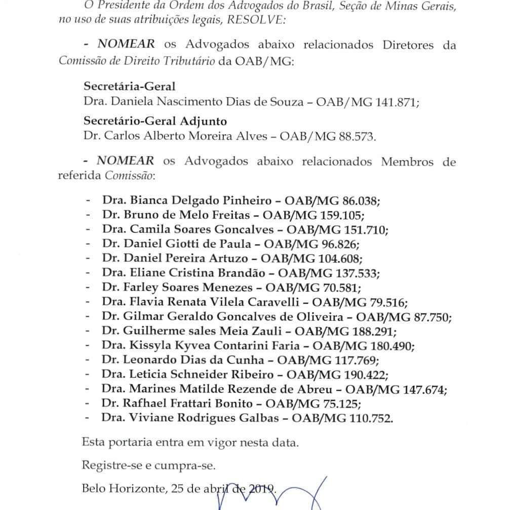 A sócia Flávia Vilela Caravelli é nomeada como membro da Comissão de Direito Tributário da OAB/MG para o triênio 2019/2021, ao lado de grandes nomes do cenário tributário mineiro, sob a Presidência de João Paulo Fanucchi de Almeida Melo. Presidente da Seccional: Raimundo Cândido. Confira a portaria de nomeação.
